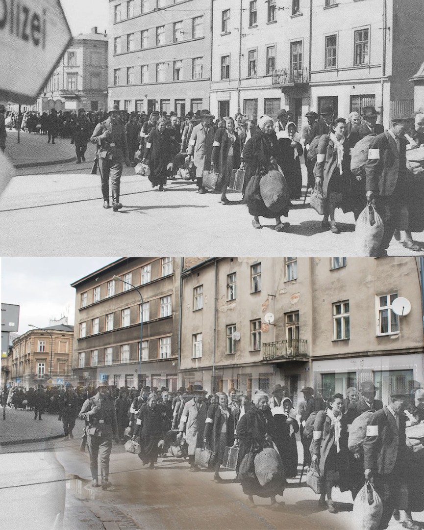 18 yaşındaki lise öğrencisi Zoar Azar’ın fotoğraflarında, Holokost’a ait siyah-beyaz fotoğraflarda görünen kişiler, mekanın bugünkü renkli fotoğrafının içine montajlanmış.