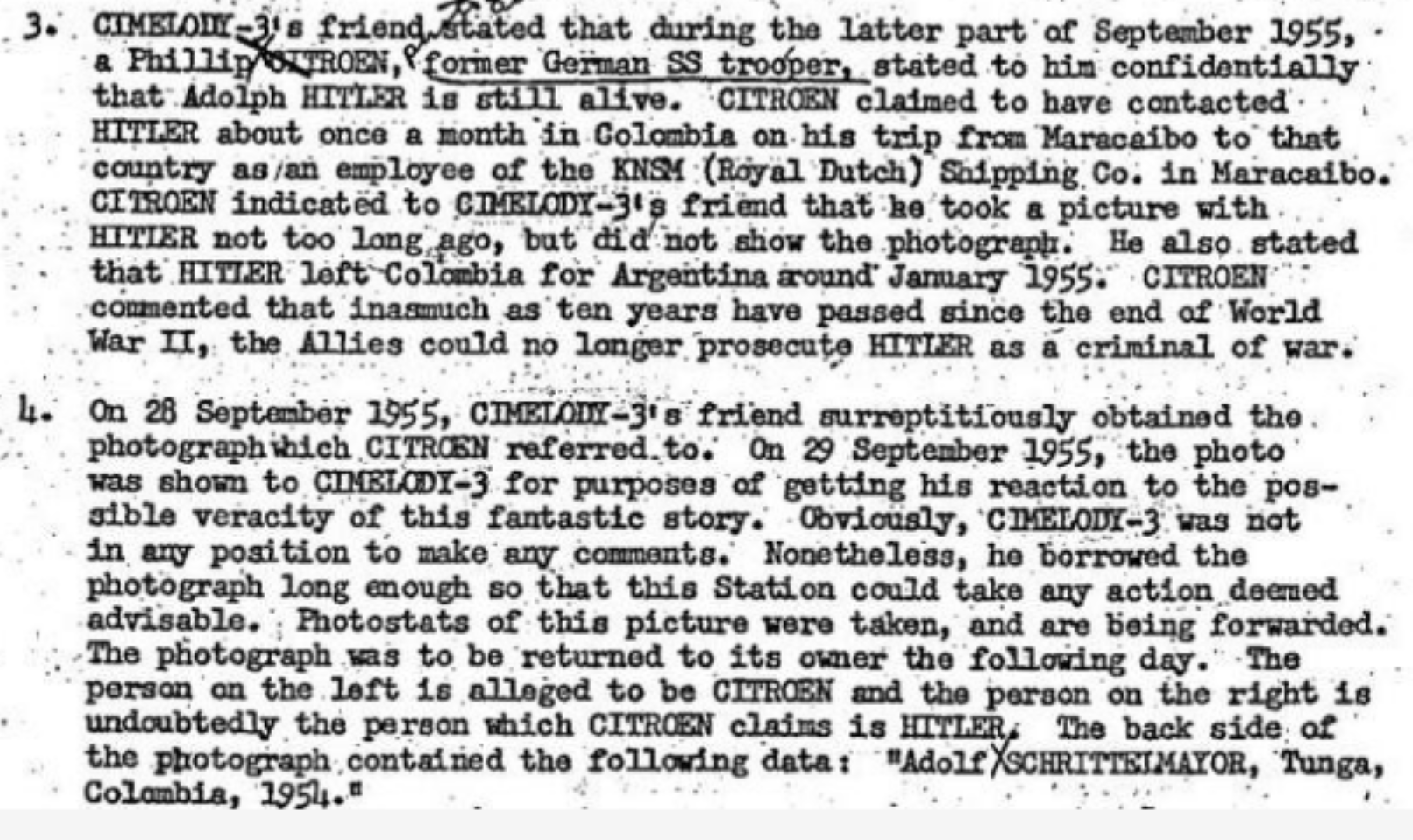 Resmi tarih Hitler'in saklandığı Berlin’deki sığınakta intihar ettiğini belirtmesine rağmen, çeşitli komplo teorileri sıklıkla Hitler'in İkinci Dünya Savaşı'nın sona ermesinden sonra hayatta kaldığını iddia ediyordu. CIA'in ortaya çıkardığı belgeler bu teoriyi destekler nitelikte.