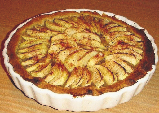 Tart için: 800 gr elma, 50 gr file badem, 40 gr toz şeker, 40 gr. pudra şekeri, 10 gr. yağ, 1 portakalın suyu, 10 cl. Calvados