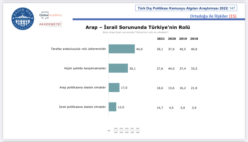 On yıldır Türkiye’nin nabzını tutan 'Türk Dış Politikası Kamuoyu Algıları Araştırması'nın 2022 yılı sonuçları 8 Eylül günü bir basın toplantısıyla açıklandı. Kadir Has Üniversitesi Öğretim Üyesi Prof. Dr. Mustafa Aydın koordinasyonunda akademik bir ekip tarafından yürütülen çalışmada Türkiye temsiliyetine sahip 26 ilde yaşayan 18 yaş üzeri bin kişiyle yapılan görüşmelere dayanan araştırma, 25 Mayıs - 7 Haziran 2022 tarihleri arasında Akademetre Araştırma ve Stratejik Planlama tarafından gerçekleştirildi.