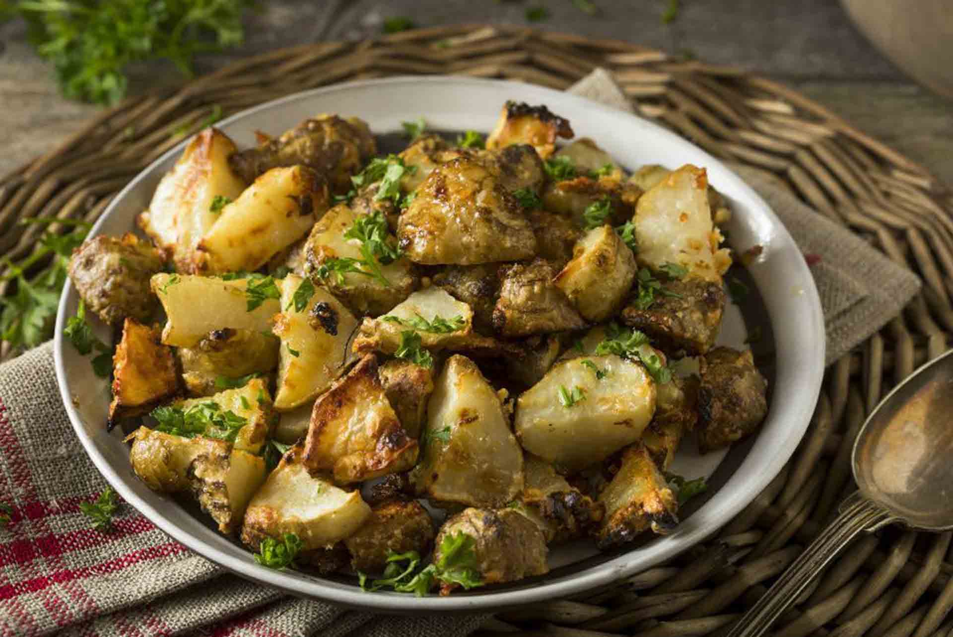 Fırını 200 dereceye ısıtın. Yer elmalarını bir fırça yardımıyla iyice yıkayın ve sonrasında soğanları büyük parçalar halinde doğrayın. Yer elmalarını büyük ve eşit parçalara bölüp fırın tepsisine yerleştirin. Büyük parçalar halinde doğradığınız kırmızı soğanları da serpiştirin. Tuz ve karabiberi ekledikten sonra zeytinyağını gezdirin. Kekikleri ekledikten sonra tekrar karıştırın. Önceden ısıtılmış fırında yaklaşık 20-25 dakika pişirin. Pişip pişmediğini bir bıçak yardımıyla kontrol edebilirsiniz. Tadının patatese benzerliğini siz de inanamayacaksınız, şimdiden afiyet olsun.
