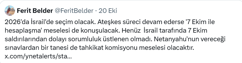 •“Gazze´deki ateşkesin veya barış planının kabul edilmesinden sonra ´Netanyahu uyacak mı buna´ yorumları çok yapıldı. Fakat buna Trump uyacak mı? Netanyahu kadar Trump da bu görevi sürdürmeli. Açıkçası Netanyahu, Türkiye´yi Gazze barış gücünde istemiyor. Mısır ile Katar´ın olmasını da istemiyor gibi duruyor. Arap dünyasındaki yapı şu: Hamas´a verilen desteğin tamamen sonlanması gerekiyor.” Ali Semin – www.anlatilaninotesi.com.tr