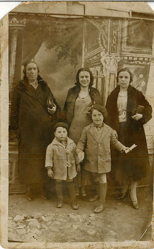 1935 yılında Kasımpaşa’da çekilmiş olan bu fotoğraf, Benoziyo ve Yanni Ailelerine ait. Arka plandaki perde ve süslü, desenli pano; fotoğrafın seyyar ya da stüdyo fotoğrafçılar tarafından çekilmiş olabileceğini düşündürmektedir. Zemindeki taş döşeme ve fondaki sütunlu yapı tasviri, dönemin fotoğraf stüdyolarında sıkça kullanılan sahne dekorlarını yansıtır.
