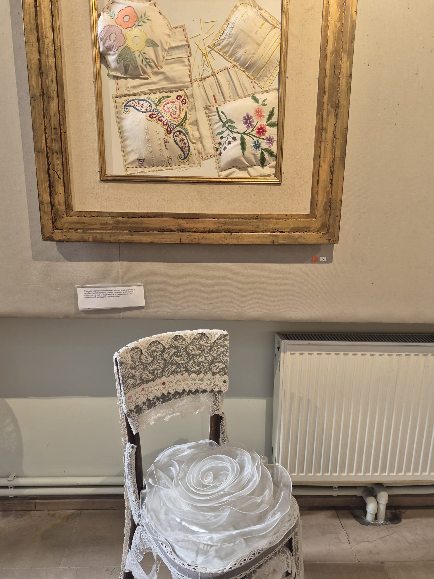 Un tablo ande aviya almoadas kuzidas de mano i enriva finalizados kon reliefes. Un tablo ande estavan ijikos djugando en las kayes komo muestra manseves i munchas otras kozas.