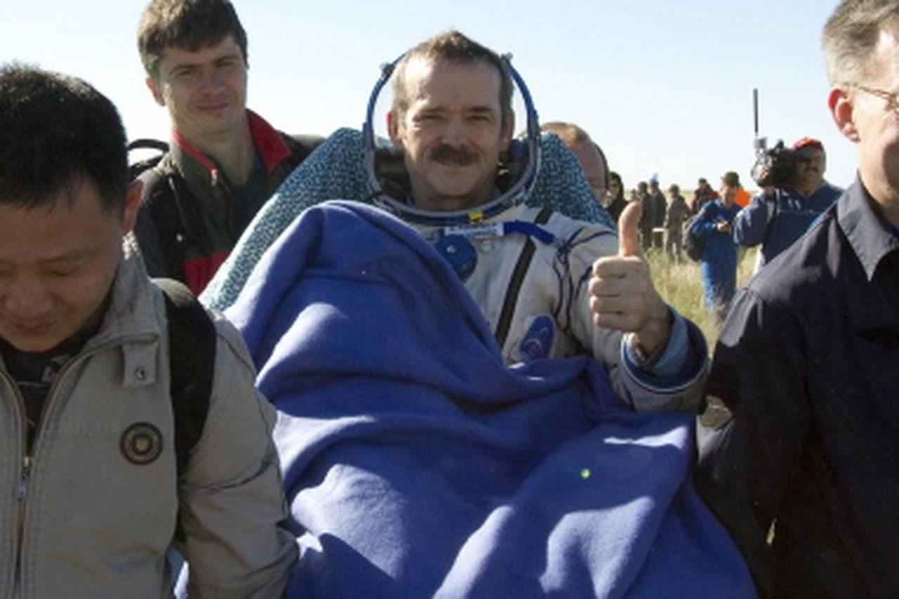 Uzaydan dönüş anlarına da değinen Hadfield, 3,5 saat içinde bulundukları o minicik kapsülle atmosfere girerken araçtan sürtünmeyle kopan parçaları ve alevleri gördüklerini ama aracın yeterince kalın olduğu için korkmadıklarını, paraşütle iniş anında yuvarlanarak yerden birçok kez sekerken içeride yaşadıklarını ve kapsülden çıkarken aynen ana rahminden bebek çıkarır gibi onları küçük yuvarlak kapısından çektiklerini söyledi, kendilerinin hareket etme kabiliyeti yok denecek kadar az çünkü. Uzun uzay kalışlarından sonra yeryüzüne inmek her iki anlamda da yeniden doğmak gibiydi. Astronotlar bu anda mide bulantısı hissedebilir, başı döner, zayıftır ve denge sistemi tamamen bozulmuş olabilir. Yerçekiminin ne kadar kötü olduğunu fark eder. Tüm bu olumsuz hislere rağmen, Hadfield parmağıyla her şey yolunda işareti yaptığını ancak kısa süre sonra kustuğunu söyledi.