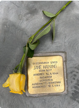 İskoçya, savaş sırasında Yahudi çocuklarını korumak için Budapeşte'de kalmayı seçen ve bu nedenle Auschwitz'de öldürülen İskoç kadın Jane Haining'in anısına ilk Stolperstein'ı dikti.