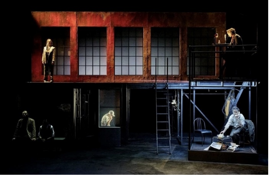 Üçlemede başlı başına bir karakter olan New York, loş arka planda tipik bir kırmızı tuğla bina olarak beliriyor. Birkaç sokak lambası, metal merdivenler, karakterlerin sürekli hareketi, anlatının labirentvari doğasını çağrıştırırken gösteriye nüfuz eden kara film atmosferini vurguluyor. Yağan yağmur, şehir ışıkları, New York binalarının gölgeleri, pencerelere yansıyan gece ışıkları, asansör platformu, bilinmeyen bir şeye bağlanan ve görünüp kaybolmaları düzenleyen kapılar, insanların geçtiği, kaçtığı ve birbirini kovaladığı koridorlar gerçek dışılığı daha belirginleştiriyor.