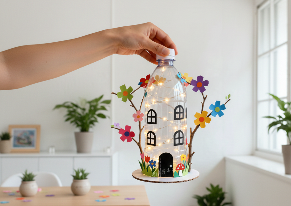 Plastik şişe süslenir ve etrafına renkli ışıklar eklenir. İşte ev görünümünde bir gece lambası, bu soğuk havalarda evinize renk getirecek. Bu etkinlikte ışığın Hanuka’daki sembolik anlamına da gönderme yapıyoruz: Işık çoğalır, paylaşılır ve en küçük bir nokta bile karanlığa meydan okuyabilir.