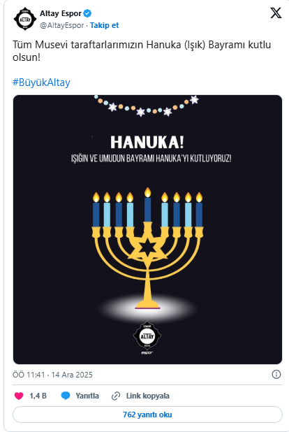 İzmir’in köklü kulübü Altay Spor Kulübü’nün Espor Şubesi’nin X hesabından Musevilerin Hanuka Bayramı’nı kutlayan bir mesaj paylaşıldı.