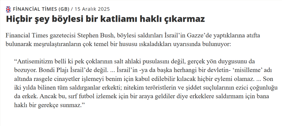 •Bondi´de yaşananlar, İslam´ın ne olduğuna dair bir hikâye anlatmıyor. Anlattığı şey, şiddeti dine bağlayan kolay çerçevelerin ne kadar kırılgan olduğu. Hanukah´ı hedef alan antisemitik bir saldırı, başlı başına açık ve tartışmasız bir tehdit olarak duruyor. Bu tehdidin ciddiyeti, saldırının failinin kimliğine bakılmaksızın tanınmayı hak ediyor. Ancak aynı olayda, şiddeti durduran bir müdahalenin varlığı, bu tehdidi açıklamak için başvurulan hazır anlatıları boşa düşürüyor. •Yasemin Akyol Başar – www.serbestiyet.com