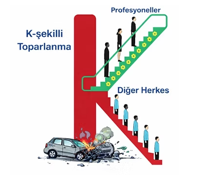 COVİD pandemisinin başladığı senelerde ekonomistler “K şekli ekonomi”den bahsetmeye başladılar. Tipik bir ekonomik krizden farklı olarak Bütün dünya ekonomisini etkileyen COVİD ve büyük savaşlar ise bir kırılma veya duvara çarpma noktası oluşturur. Şöyle ki, ekonomiyi inişli çıkışlı bir yolda giden bir araba gibi düşünün: Hiçbir uyarı olmadan karşısına yolun ortasında bir duvar çıkıyor. Çarpmadan durmak imkânsız. Arabanın bir kısmı ve bazı yolcuları diğerlerinden fazla hasar görüyor. Sonra toparlanma başlıyor.