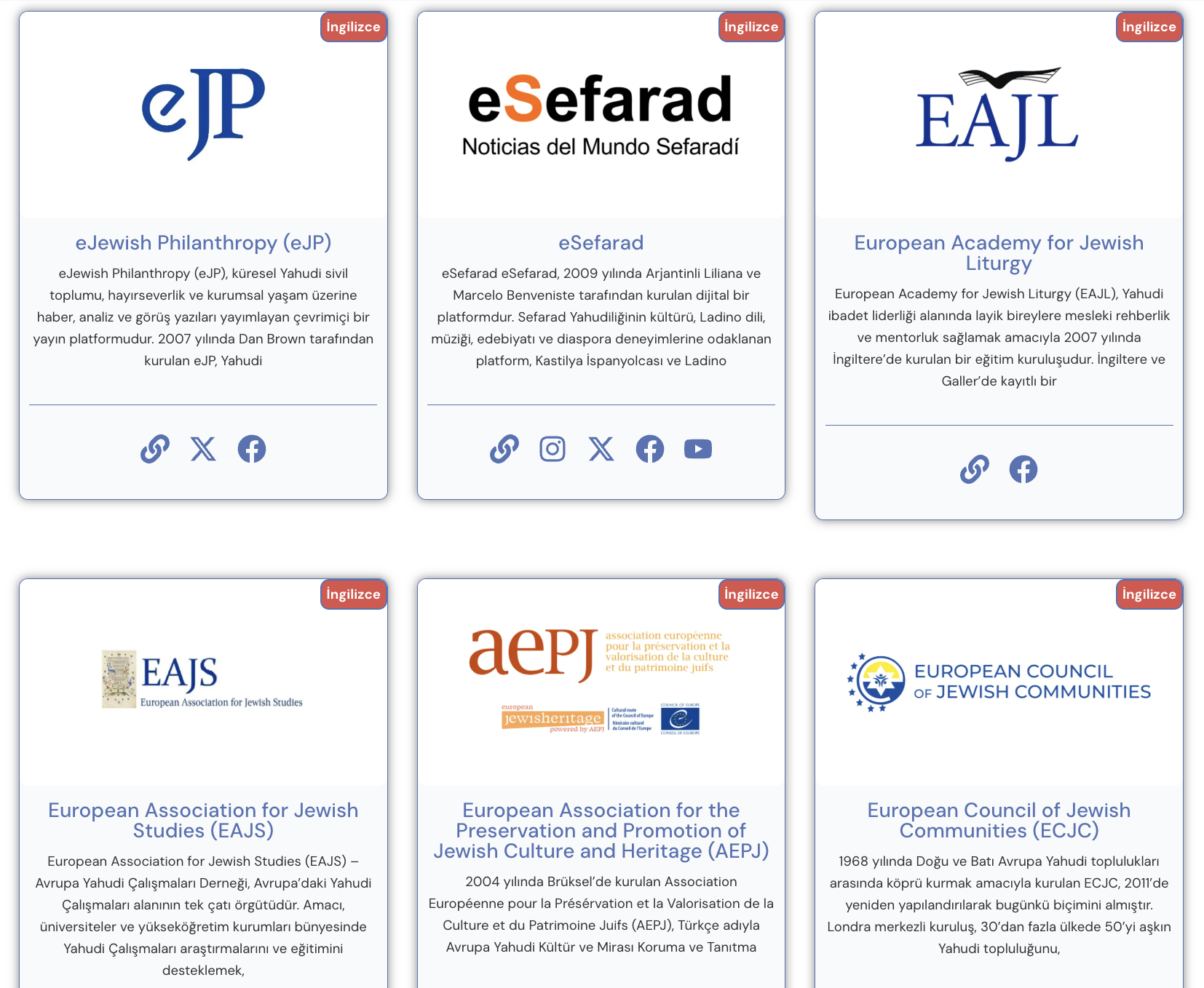 Şimdi bu bölümde akademik kurumlar, müzeler, dijital arşivler, sivil toplum kuruluşları, eğitim platformları, podcastler, dergiler, müzik arşivleri, dil öğrenme kaynakları bir arada. A'dan Z'ye alfabetik sırayla listelenmiş. Her sitenin adı, kısa Türkçe özet bilgisi, hangi dilde olduğu, hangi konulara odaklandığı ve sosyal medya bağlantıları var. Din, kültür, müzik, dil, tarih, sanat... Daha da elimde eklenecek 100'e yakın site var. Bu siteler hakkında bilgi toplarken Judaism Unbound, MyJewish Learning ve Qesher gibi platformların online etkinliklerini de daha yakından takip etmeye başladım.