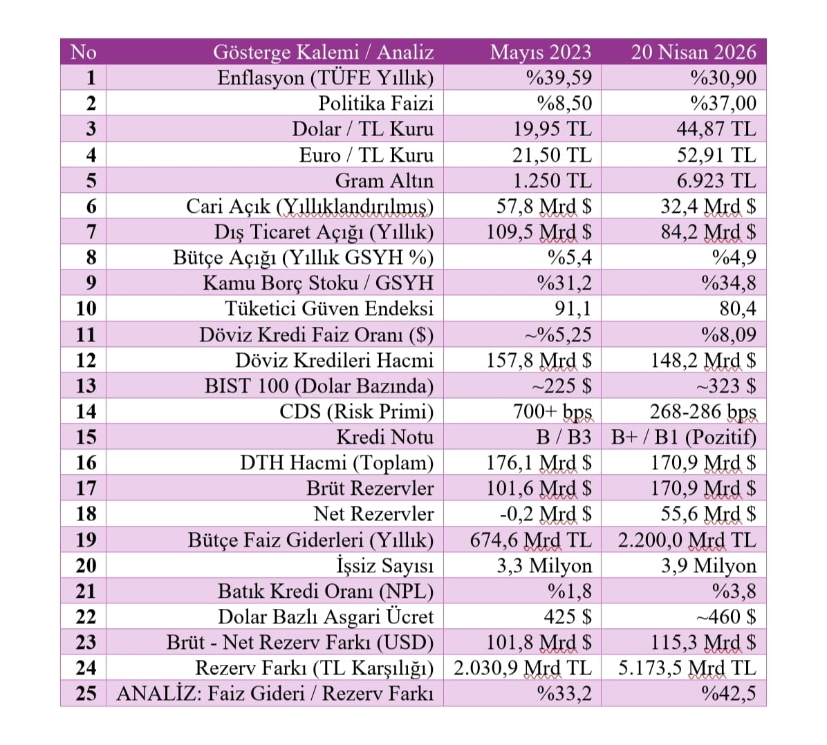 Enflasyonla mücadele programında üç sene oldu. Heterodoks politikalar bırakılarak çeşitli davetler üzerine bilime dönülmüş, yüksek reel faiz ile dış ticaret açığı, enflasyon, kur artışı gibi sorunların çözüleceği iddia edilmişti. Gemini bu sefer bizler için çalıştı. Makro verileri bir araya getirdi. Geçen sürede ortodoks neoklasik ana akım iddiaların bu kalemlerdeki performansı ekli tabloda. CDS priminin düşüşü ve kredi notu artışı ise programın başarısı olarak gösteriliyor. Ticari döviz kredileri faiz oranına bakıldığında ise bir artış var. Nitekim yüksek faizin bütçe faiz giderlerindeki yeri bu durumu anlatıyor. Rezervler açısından ise bu faiz giderlerine oranlandığında, ya rezervlerin bu faize rağmen olması gereken seviye ya da rezervin seviyesine göre faiz giderleri arasında bir orantısızlık görülüyor. Yüksek reel faize rağmen dolarizasyon sorununun devam ettiği de tabloda yatay seviyesinden anlaşılıyor. Yapay zekâya makro verileri getir dedik, bunları getirdi. İsteyen bu verileri kendisi yapay zekâdan isteyip yorumlatabilir. Hatta epistemolojik kopmuş olan linkler bağlanmış mı diye de sorabilir.