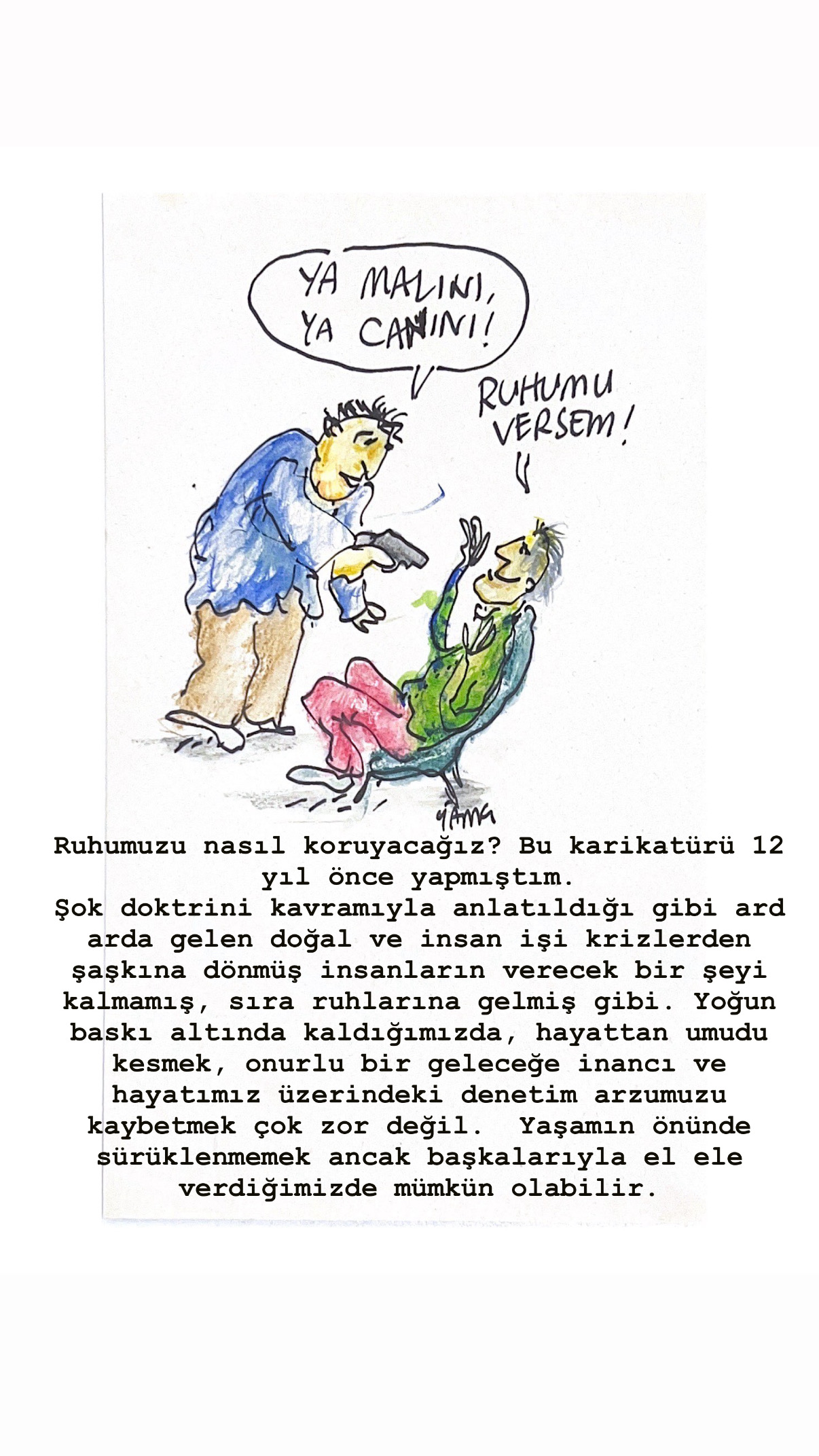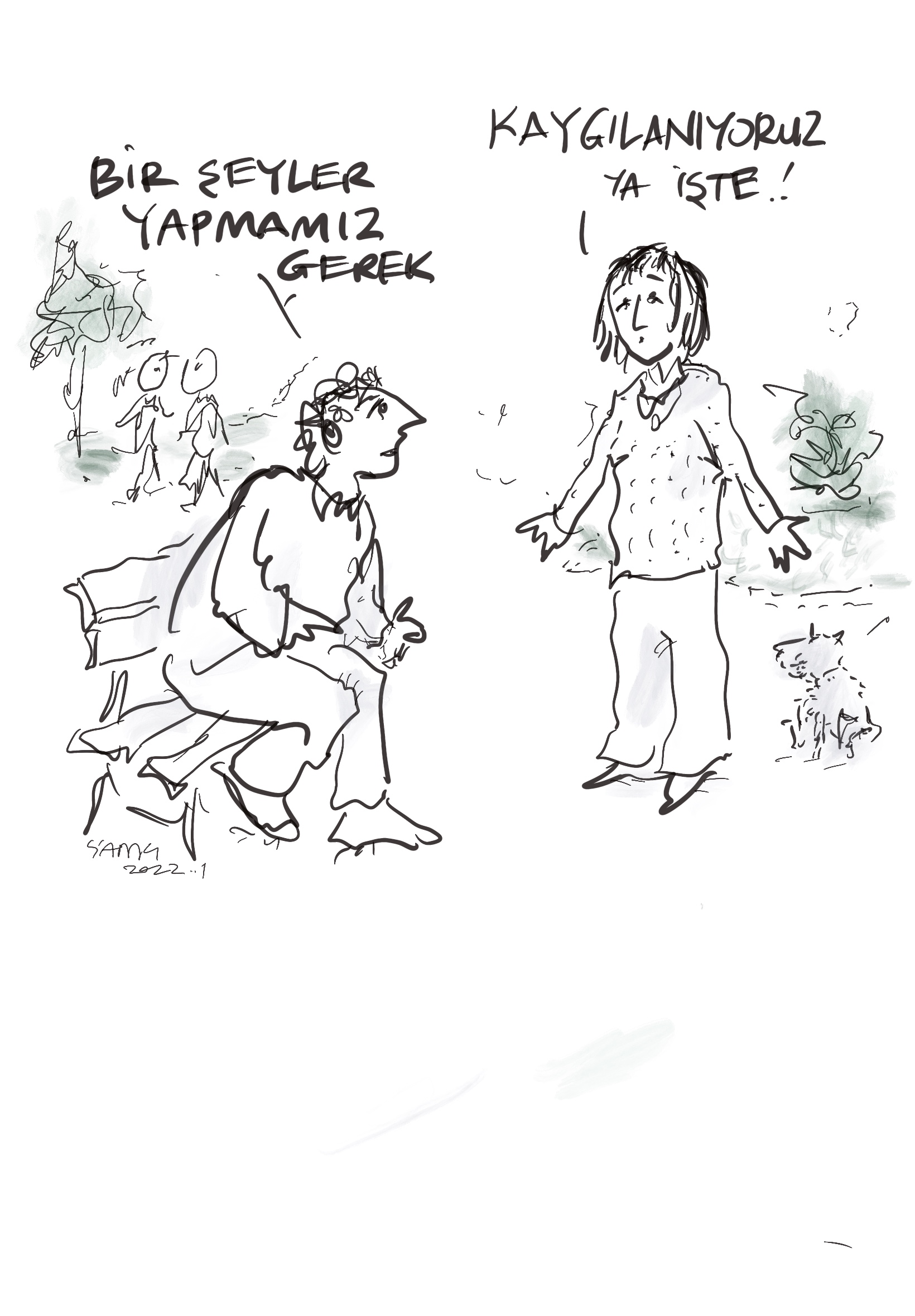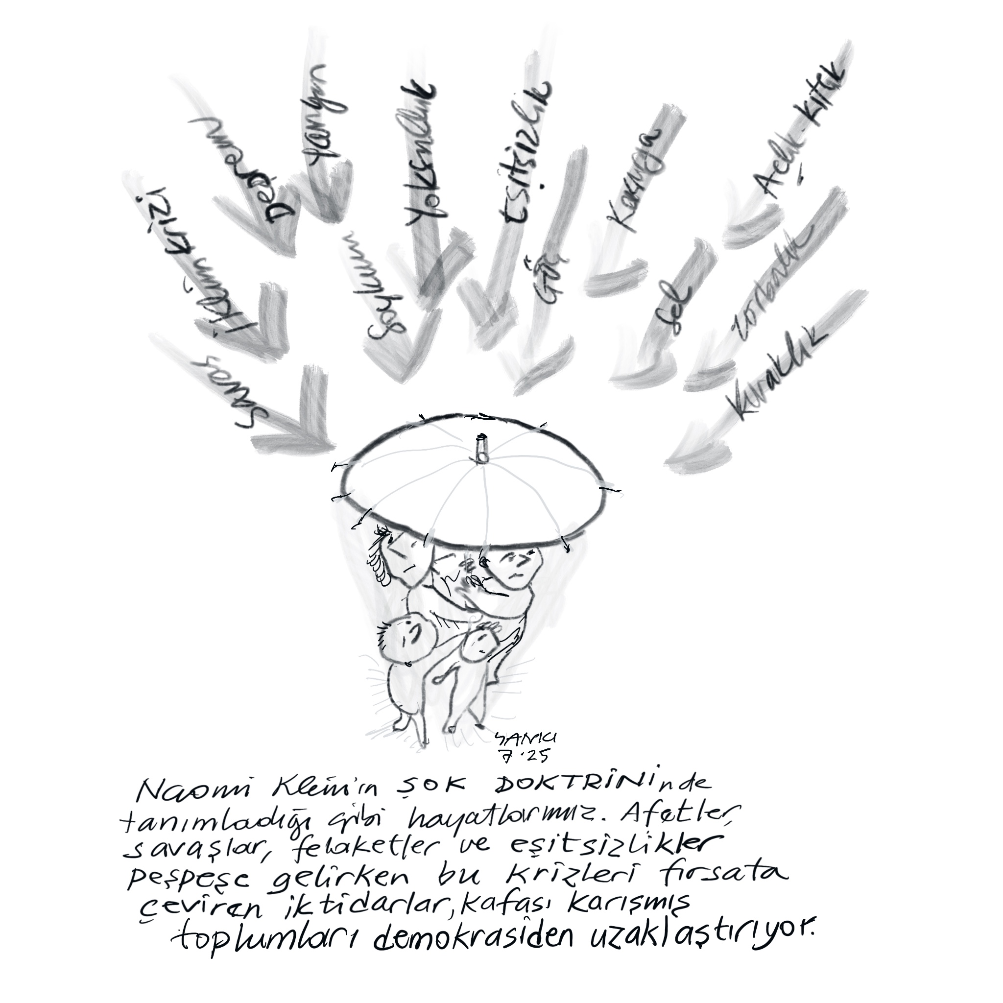 2025’i unutmak ne mümkün… Ama hatırlamakta, sahiden ne oldu ne bitti, ne zaman oldu sorularını cevaplamakta zorlanıyoruz. Bu çelişkili durumu yaşadığımız duyguların yoğunluğuna, iç içe geçmiş birbirinin karşıtı duyguyu aynı anda yaşamış olmamıza bağlıyorum. Her yaşantı belleğimizde varlığını sürdürse de, adeta sırası, yeri karışmış bir şekilde depolanmış olduğundan ötürü 2025’te neler oldu, neler hissettin dediklerinde söylediklerimiz birbirini tutmayabilir. Ben de bu yıl içinde çizdiğim karikatürlere dönüp baktım. O sırada beni her ne etkilemişse, onu kâğıda geçirdiğimden bir tür kayıt tutmuş gibi oldum. Yoksulluk, eşitsizlik, şiddet gündelik tanıklıklarımız olurken, dünyanın gidişinin yarattığı çelişkili duyguları yansıttığım karikatürlerin pek güldürücü olmadığını fark ettim. Yüzümüzün gülmediği bir senenin mizahı da bu kadar oluyor, en azından benim yaptıklarımda…