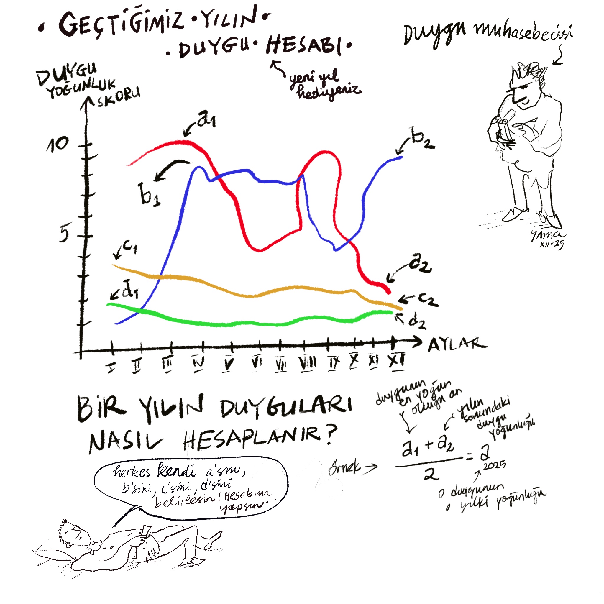 Daniel Kahneman kendisini ve çalışma ortağı Amos Tversky’yi Nobel Ödülü’ne götüren yolda duyguların karar ve seçimlerimizdeki rolünü araştırarak önemli bulgular elde etti. Bir tanesi de bu bir ‘süreç duygusu’ hesaplama yöntemi. (bkz. Çizgideki hesaplama). Çizgiyi okumakta zorlanırsanız özü şu: Bir zaman dilimi içinde, belli bir duygunun en yoğun olduğu andaki düzeyi ile zaman diliminin sonunda o duygunun düzeyini toplayıp ikiye böldüğünüzde o duygunun o yıla özgü yoğunluğu çıkıyor. Farklı duygular için hesaplayıp sıraladığınızda birinciliği kime vereceğiniz ortaya çıkıyor! Enflasyon hesabına benzetebilirsiniz…